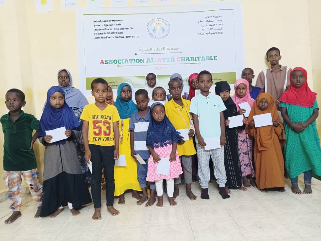 IntroductionA l’occasion de l’Aïd al-Fitr et en conformité avec ses valeurs de solidarité et d’entraide, l’Association Al-Atta Charitable a organisé une initiative visant à soutenir les enfants orphelins et issus de familles démunies de Balbala. Cette action s’inscrit dans la mission de l’association de venir en aide aux plus vulnérables de la société, notamment en période de festivités où la générosité et le partage sont primordiaux. Objectifs de l’initiative Déroulement de l’événementL’événement a eu lieu le vendredi 28 mars 2024 au siège social de l’Association Al-Atta Charitable. La cérémonie de distribution a été marquée par la présence de membres de l’association, de bénévoles et de représentants communautaires. L’atmosphère était empreinte de joie et de gratitude, les enfants ayant reçu leur enveloppe dans un cadre chaleureux et bien organisé. BénéficiairesUn total de 40 enfants orphelins et issus de familles démunies ont bénéficié de cette aide, principalement résidant dans les quartiers de Balbala 11. Chaque enfant a reçu une enveloppe contenant une somme de 5000 francs, destinée à leur permettre de célébrer l’Aïd avec plus de sérénité. Impact et témoignagesLes familles concernées ont exprimé leur gratitude envers l’association pour cette initiative qui allège leurs charges en période de fête. Les enfants, quant à eux, ont manifesté leur bonheur à travers des sourires et des remerciements sincères. Cette action a renforcé l’engagement de l’Association Al-Atta Charitable à poursuivre ses efforts en faveur des plus démunis. Conclusion et perspectivesL’Association Al-Atta Charitable réaffirme son engagement à soutenir les enfants vulnérables et les familles dans le besoin. Forts de la réussite de cette initiative, nous envisageons de multiplier ce type d’actions à l’avenir, avec l’objectif d’étendre notre aide à un plus grand nombre de bénéficiaires. Nous remercions tous les partenaires et donateurs ayant contribué à la réalisation de cet événement et espérons continuer à oeuvrer ensemble pour le bien-être des plus vulnérables.
